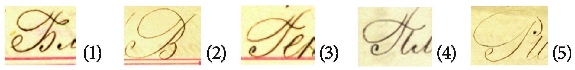 Fig. 10. The capital letter “E” in the cursive workbooks (1, 2), in the 1857 Dostoevsky’s report (3) and in manuscripts of 1854 (4) and of 1856 (5)