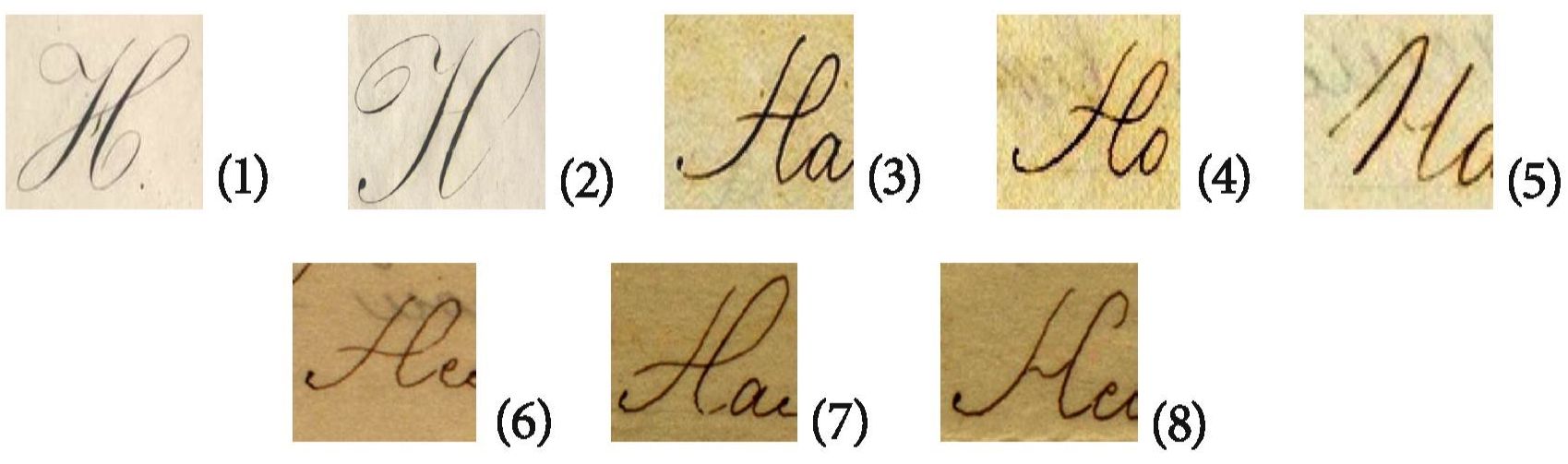 Fig. 13. The capital letter “Н” in the cursive workbooks (1, 2) and in manuscripts of 1854 (3, 4, 5) and of 1856 (6, 7, 8)