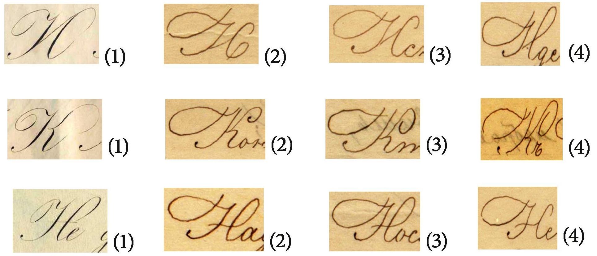 Fig. 14. Samples of capital letters “И”, “K”, “Н” in Dostoevsky’s petition addressed to Emperor Alexander II
