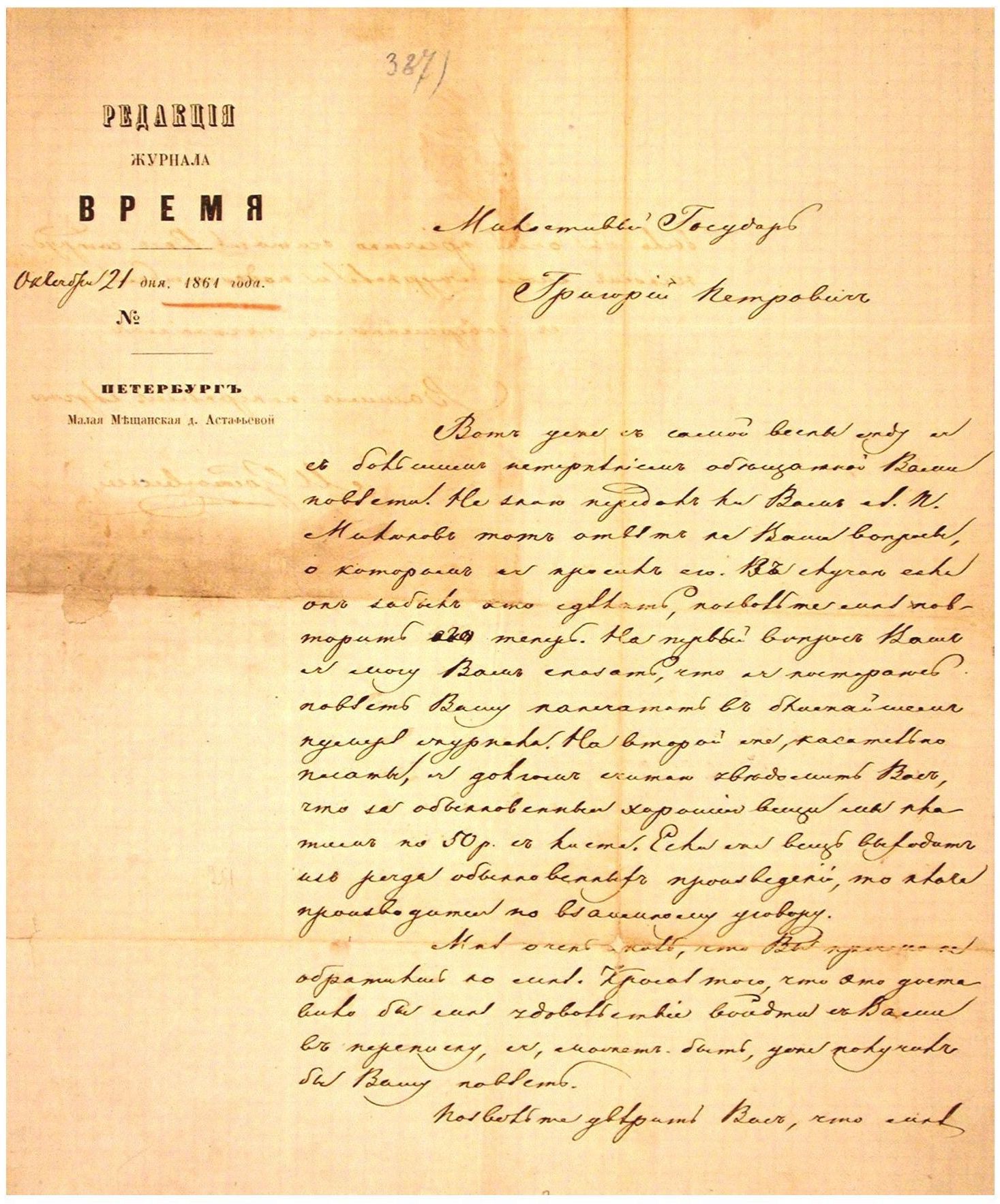 Fig. 3. The first page of M. M. Dostoevsky’s letter to G. P. Danilevsky dated October 21, 1861. Handwriting type is cursive