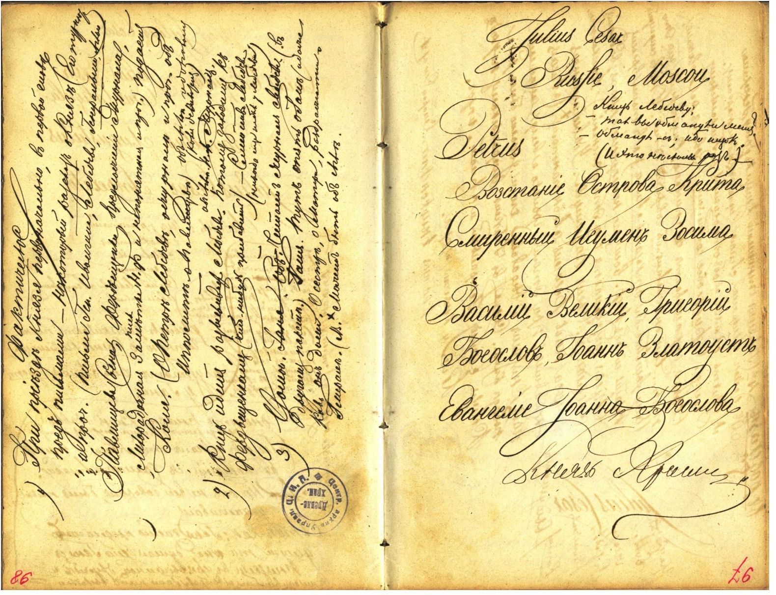 Fig. 9. Spread of F. M. Dostoevsky’s notebook, 1868–1869. On the left page there is correct cursive writing, on the right page there is calligraphy, cursive