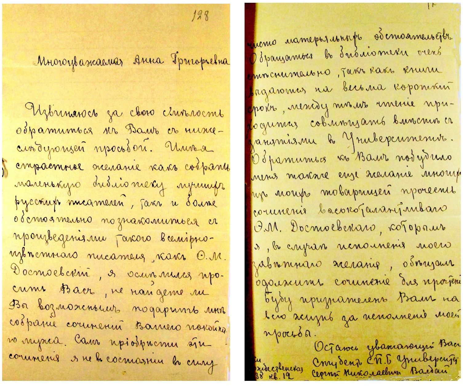 Илл. 3. Письмо А. Г. Достоевской от бедного студента с просьбой исполнить его заветное желание: подарить экземпляр Полного собрания сочинений для совместного чтения с товарищами66