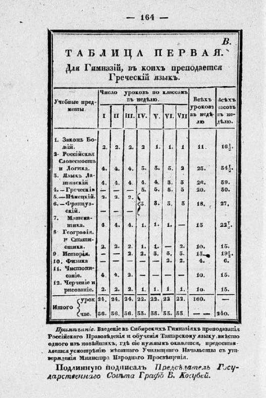 7 По древним языкам в циркуляре 1832 г. был приведен и более подробный, практически поурочный учебный план, составленный Ф. Б. Грефе, с указаниями относительно методики объяснения и проверки материала (Распределение: 33–37).