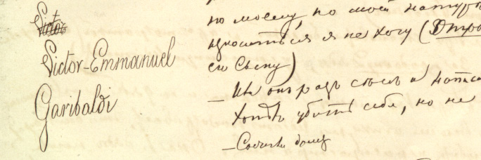 «Обнимите еще разъ Масеньку. Я слышалъ что <1 слово нрзб.> произведенъ въ Генералъ-Лейтенанты Папской арміи и будетъ играть {на дудочкѣ} польку своего сочиненія на разбитіе Гарибальди, а Кардиналъ Антонелли и Генералъ-Канцлеръ (за даму) танцовать въ присутствіи Папы, а Юлинька будетъ смотрѣть и сердиться. Поцалуйте [и] {ее} тоже, если допуститъ поцаловать (отъ меня!) Витю тоже отъ меня {поцалуйте} и хваленаго Лёлю. Затѣмъ всѣхъ; а братцу Александру Александровичу пожмите отъ меня руку покрѣпче»12.