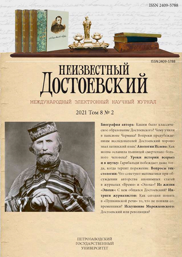 До последнего времени исследователи обращались к теме «Достоевский и Гарибальди» фрагментарно. Так, В. С. Нечаева рассмотрела эпизоды с Гарибальди в политических обозрениях на страницах журнала братьев Достоевских «Время» [Нечаева, 1972: 156–163]. А. Блума добавила к этому материалу ряд ценных наблюдений, касающихся темы «Гарибальди в 1862 году» [Блума: 60–67]. Наконец, личные впечатления Достоевского от встречи с Гарибальди в Женеве в 1867 г., зафиксированные в стенографическом дневнике его жены1, прокомментированы их публикатором [Житомирская: 435–437]. М. И. Ковальская обратилась к исследованию образа итальянского полководца в публицистике писателя начиная с «Зимних заметок о летних впечатлениях» (1863) [Ковальская: 142–149]. Упоминания Достоевским имени Гарибальди в записных тетрадях и подготовительных материалах к роману «Подросток» (1875) прокомментированы в примечаниях академического Полного собрания сочинений писателя2. В. Н. Захаров проанализировал упоминание имени Гарибальди в набросках к готовившейся, но не состоявшейся новой редакции «Двойника» [Захаров: 45–46].