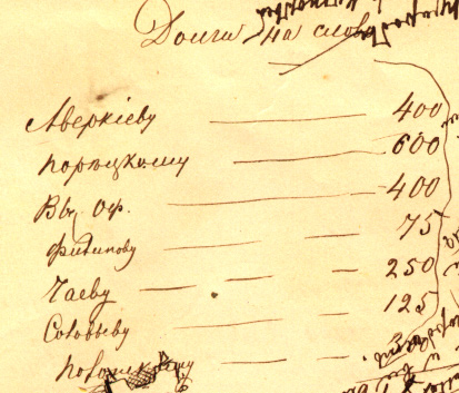 На с. 125 ЗТ₁ записаны «долги на слово», среди имен имеется сокращение, которое в публикации ЛН было прочитано как «Вас. Оф.» без расшифровки и комментария [ЛН, т. 83: 219] (см. Илл. 4). В ЗТД прочитано уже как «Вос. Оф.» и предложен следующий комментарий: «Вероятно, долг Е. П. Ковалевскому за статью “Эпизод из войны черногорцев с австрийцами. (Из воспоминаний очевидца о войнах за независимость Черногории и Италии)” (Эпоха. 1864. № 5. C. 169–193)»11.