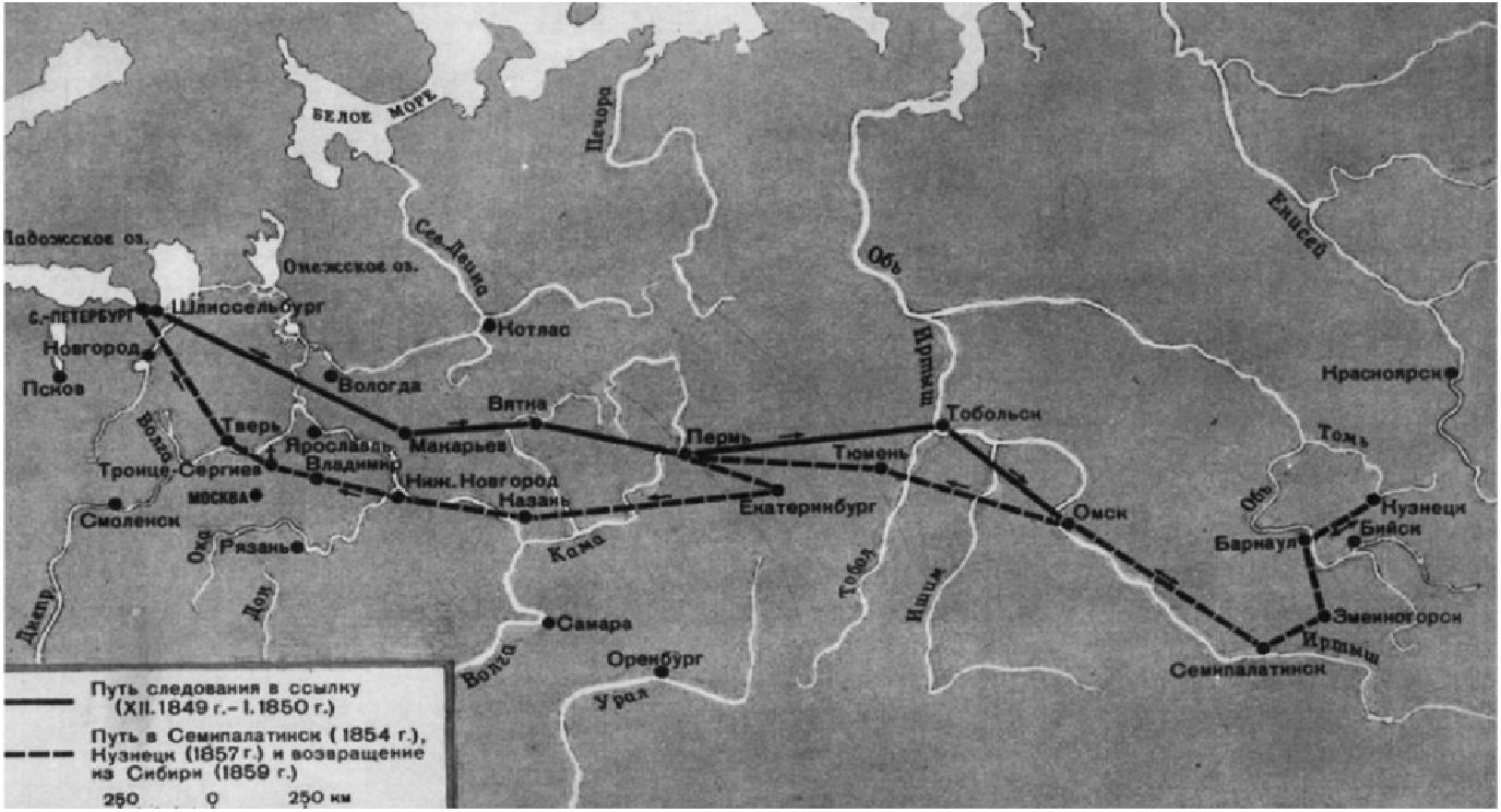 21 На карте, помещенной в альбоме «Федор Михайлович Достоевский в портретах, иллюстрациях, документах», маршрут проложен напрямую из Перми в Тобольск минуя Тюмень (см.: [Достоевский А. Ф., Коган Г. Ф., Нечаева В. С. и др.: 177]). Такой дороги не существовало.