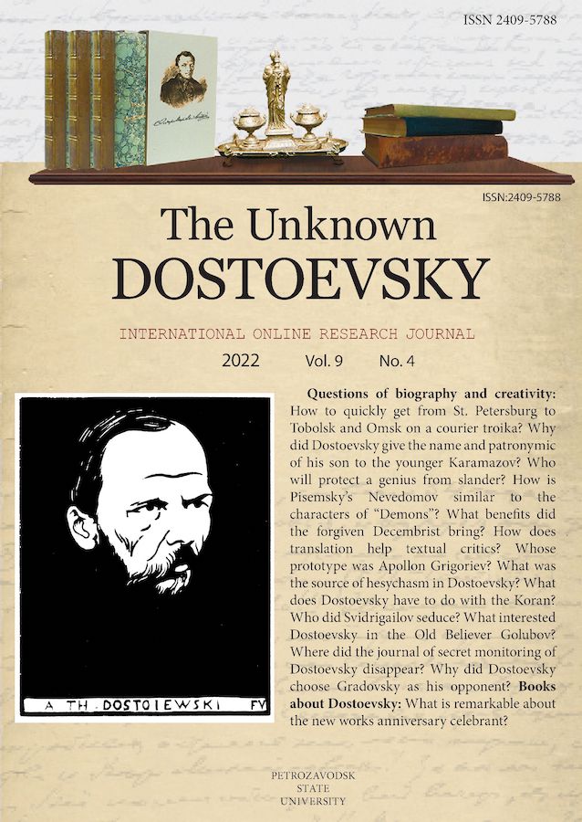 - Safronova E. Yu. Dostoevsky’s Siberian Routes. In: Neizvestnyy Dostoevskiy [The Unknown Dostoevsky], 2020, no. 1, pp. 13–41. Available at: https://unknown-dostoevsky.ru/files/redaktor_pdf/1587817401.pdf (accessed on October 5, 2022). doi: 10.15393/j10.art.2020.4541 (In Russ.)