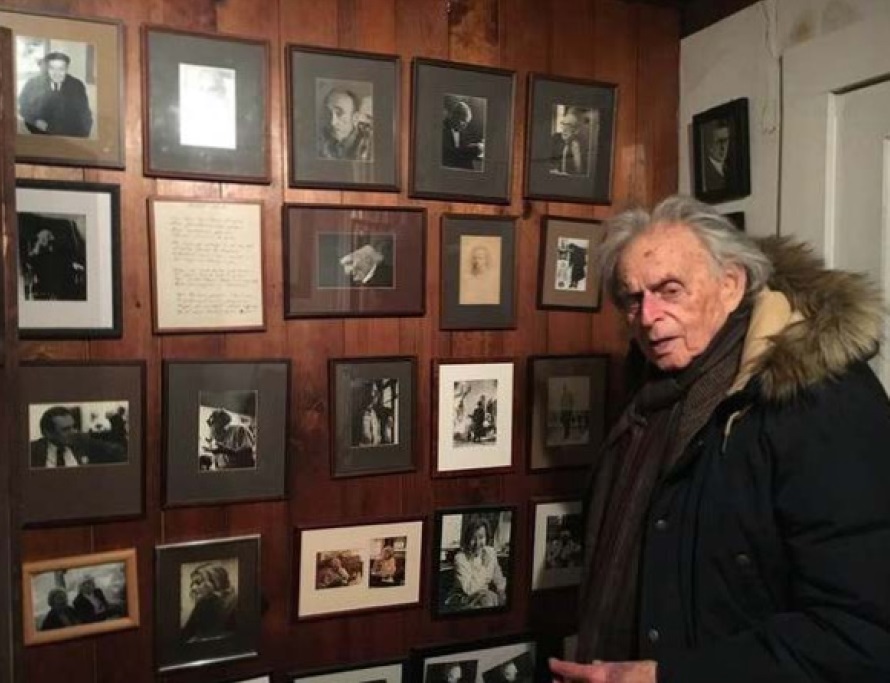 Professor Jackson at home near the “Russian wall” with portraits of famous Russian writers, philosophers, scientists