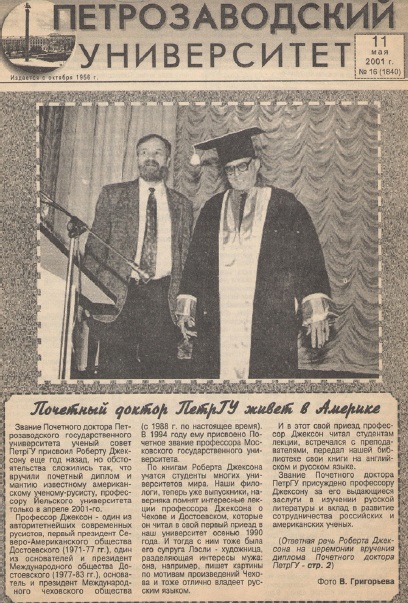 На церемонии вручения диплома Почетного доктора в ПетрГУ, состоявшейся весной 2001 г., профессор Джексон выступил с торжественной речью, опубликованной в газете «Петрозаводский университет» (2001, 11 мая, № 16). Прощаясь с Робертом Джексоном, редколлегия научного журнала «Неизвестный Достоевский» выражает глубочайшие соболезнования родным и коллегам профессора. Речь профессора Джексона, прозвучавшая в 2001 г. в стенах Петрозаводского университета, актуальна сегодня, как никогда.