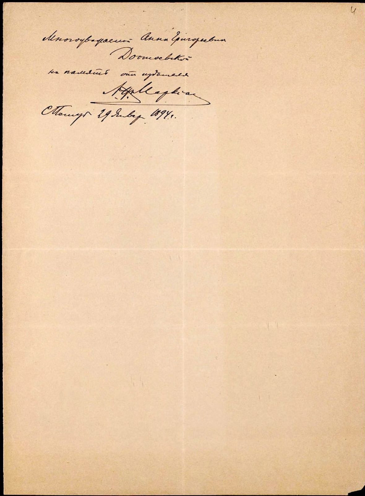 За 1894–1895 гг. издателем было выпущено 12 томов сочинений писателя, состоящих из 24-х книг. Судя по хранящейся в ОР РГБ дарственной надписи на странице «поднесенной книги»17 (см. Илл. 3), в январе 1894 г. Маркс лично передал Анне Григорьевне первый том своего издания ПСС Достоевского.
