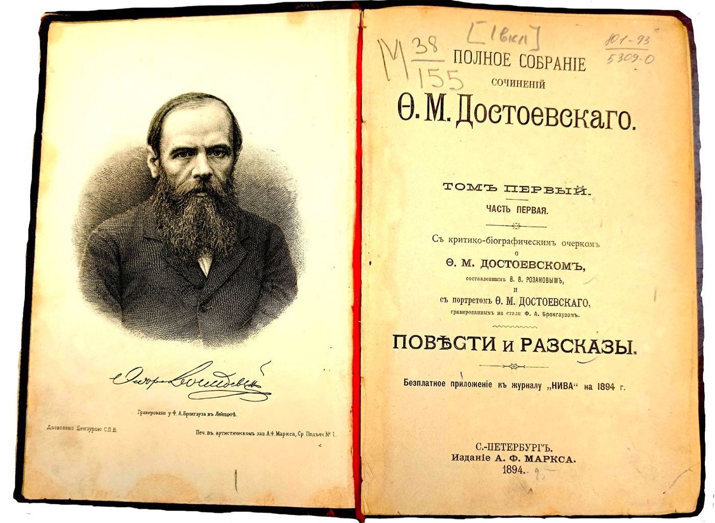 Илл. 6. Первый том ПСС Ф. М. Достоевского 1894 г.: фронтиспис с портретом писателя, гравированным на стали Ф. А. Брокгаузом; ляссе, титульный лист