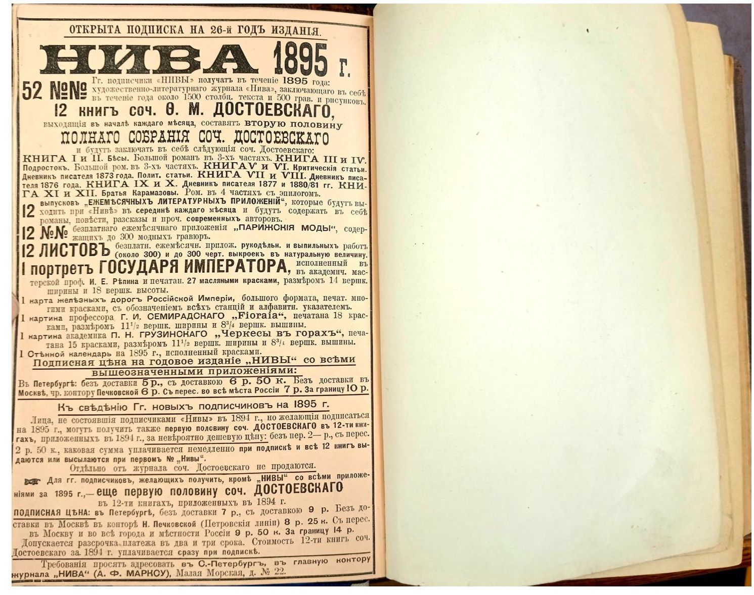 «Пожелавъ выдѣлить наступающiй 1894 годъ, мы даемъ, какъ безплатное приложенiе при Нивѣ, "Сочиненiя Ѳ. М. Достоевскаго", автора, исключительно стоящаго въ нашей литературѣ, произведенiя котораго должны составить главное основанiе домашней библiотеки каждаго образованнаго человѣка. Вслѣдствiе дороговизны, сочиненiя эти до сихъ поръ не были доступны по цѣнѣ большинству, для котораго мы и даемъ случай прiобрѣсти ихъ нынѣ, какъ безплатное приложенiе при Нивѣ за 1894 г.»14.