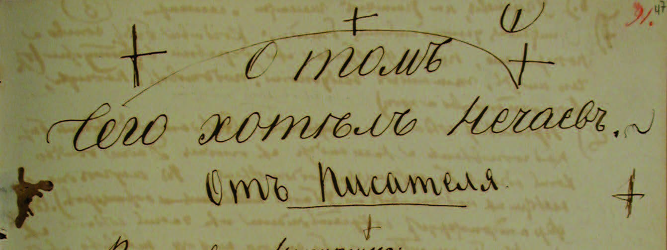Заголовок отмечен знаками «+», как и многие иные записи в этой и других тетрадях Достоевского. Условные обозначения «+» и «×» чаще всего использовались им в роли корректурных знаков, синтаксически связывающих отдельные заметки (например, основной текст и вставку в него), а также как знаки, с помощью которых автор отмечал тему, интересующий его мотив (см. подробнее: [Тарасова, 2011: 237–265; Тарасова, 2021]). Здесь второй случай. В той же тетради есть и другие записи о Нечаеве, отмеченные теми же знаками (с. 50 автографа):