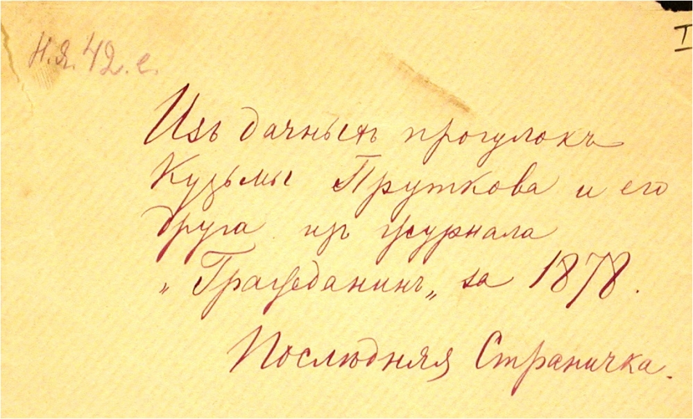 Илл. 5. Надпись на конверте рукой А. Г. Достоевской (ОР РГБ. Ф. 93.I.3.13; наборная рукопись фельетона «Из дачных прогулок Кузьмы Пруткова»)