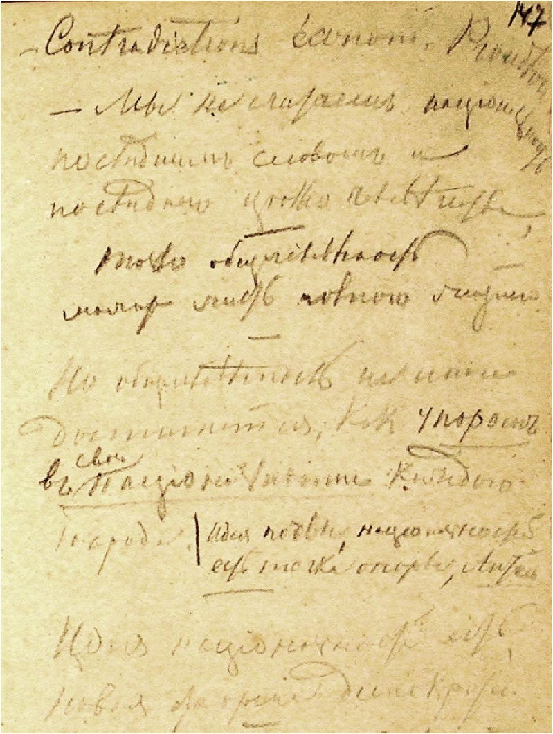 Таким образом, при определении начальной даты обеих ЗК мы можем отталкиваться только от биографических и литературных данных. ЗК1 Достоевский предположительно вел с января 1860 по октябрь 1862 г. [Заваркина: 76–90]: об этом свидетельствуют записи расчетов, публицистические замыслы и записи припадков. Последние по хронологии записи в ЗК1 — это разработка «Объявления о подписке на журнал “Время” на 1863 г.» и наброски к «Скверному анекдоту» (первое название «Несчастный случай»)4. В ЗК2 на с. 147 (по хронологии и порядку заполнения это одна из первых страниц в книжке, см.: Илл. 6) сохранились наброски, которые комментаторами Д30 также отнесены к разработке «Объявления» на 1863 г. (см.: Д30; 20: 368).