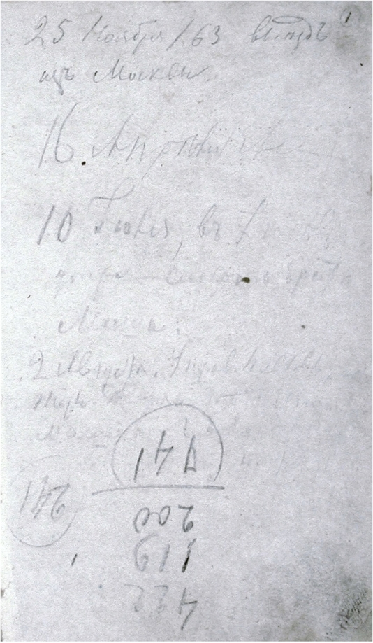 «25 ноября / 63 выѣздъ изъ Москвы. 16 Апрѣля (Eheu)