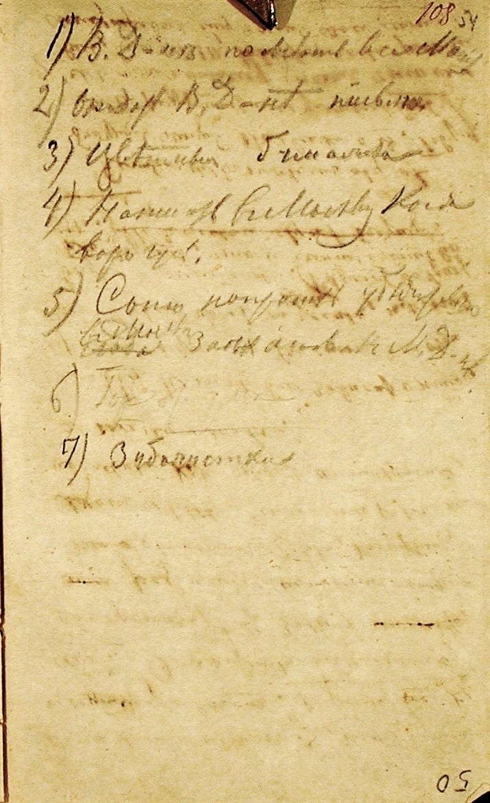 Записи на с. 50 сделаны наскоро карандашом и небрежным почерком в направлении, противоположном основной нумерации книжки. Такой разброс записей, относящихся буквально к одному месяцу (с. 8–9 и 50), еще раз свидетельствует о хаотичном ведении Достоевским своих записных книжек: он наскоро записывал важные для него мысли на первой попавшейся странице.