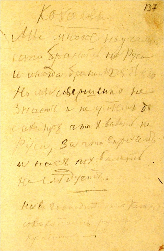 Более того, на с. 137–138 ЗК2, по мнению Викторовича, Достоевский делает наброски статьи о Дмитрии Донском, образ которого в уничижительном тоне был охарактеризован в статье Костомарова «Куликовская битва» [Викторович: 137–138]. Достоевский пишет: «Мы много научились что бранить на Руси…» (см.: Илл. 19). Эта запись была также предназначена для статьи, посвященной Н. С. Соханской (Кохановской), по поводу ее повести «Рой Федосей Саввич на спокое», опубликованной в «Дне» 1 февраля 1864 г. (см. письмо к брату М. М. Достоевскому от 5 марта 1864 г. — Д30; 282: 68–69). Позже запись на с. 137, по мнению редакторов ЛН, была развита Достоевским в «Объявлении» об издании журнала «Эпоха» на 1865 г. (опубликовано: «Эпоха». 1864. № 8) [ЛН, т. 83: 190].