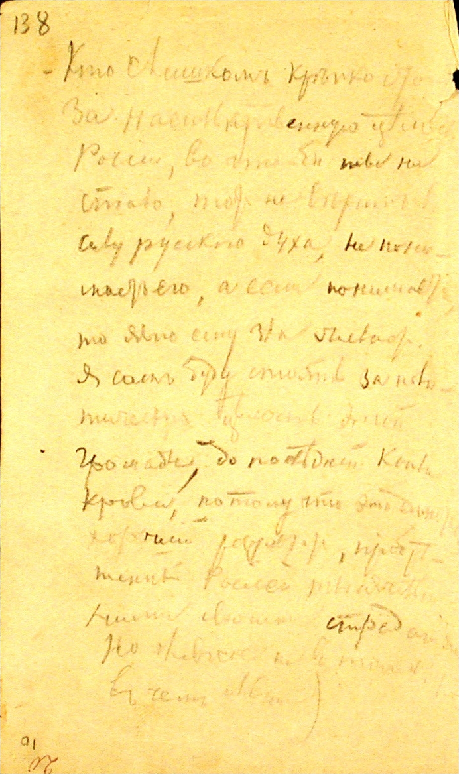 Запись на с. 138, по мнению В. А. Викторовича, также направлена против «“подкупного” патриотизма антикостомаровских статей» М. П. Погодина [Викторович: 141]: «— Кто слишкомъ крѣпко стоитъ за насильственную цѣлость Россiи, во что-бы то ни стало, тотъ не вѣритъ въ силу русскаго духа, не понимаетъ его, а если понимаетъ, то явно ему зла желаетъ» (см.: Илл. 20).