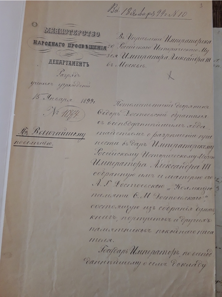 Один из документов процедуры передачи сыном Федором Федоровичем, как основным наследником, «коллекции памяти Ф. М. Достоевского» датирован 15 января 1899 г. (см.: Илл. 1). Однако собрание в целом было передано Историческому музею на вечное хранение в мае 1906 г. [Достоевская: 567].