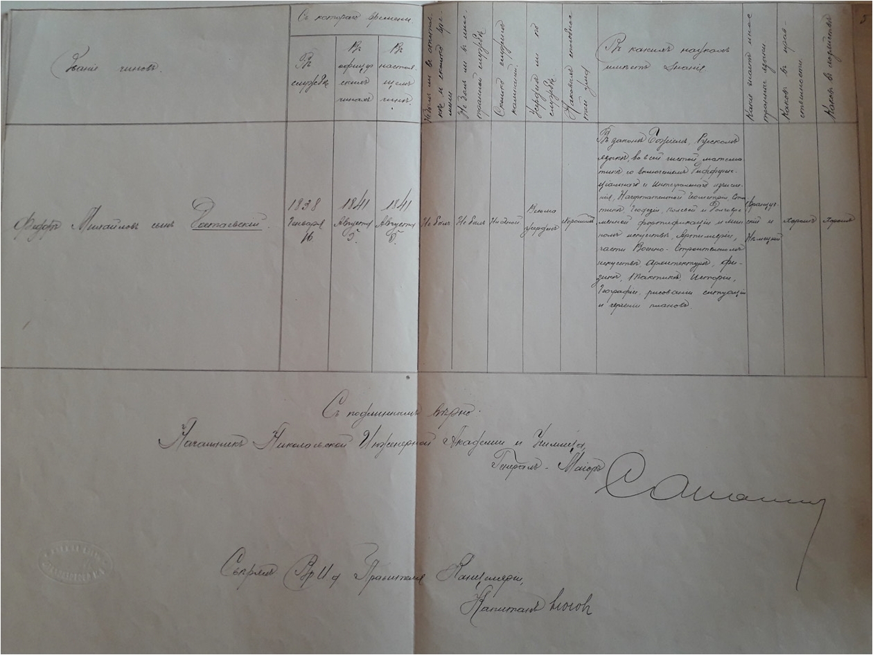 В «Выписке из кондуитного списка г. г. обер-офицерам Главного Инженерного училища за 1841 год»12 Ф. М. Достоевский представлен как воспитанник, чье поведение отличается прилежанием, а познания — широтой изученных предметов. Следующий документ — «Формулярный список о службе и достоинстве состоящего в Главном Инженерном училище полевого инженера-прапорщика Достоевского» от 1 января 1842 г.13