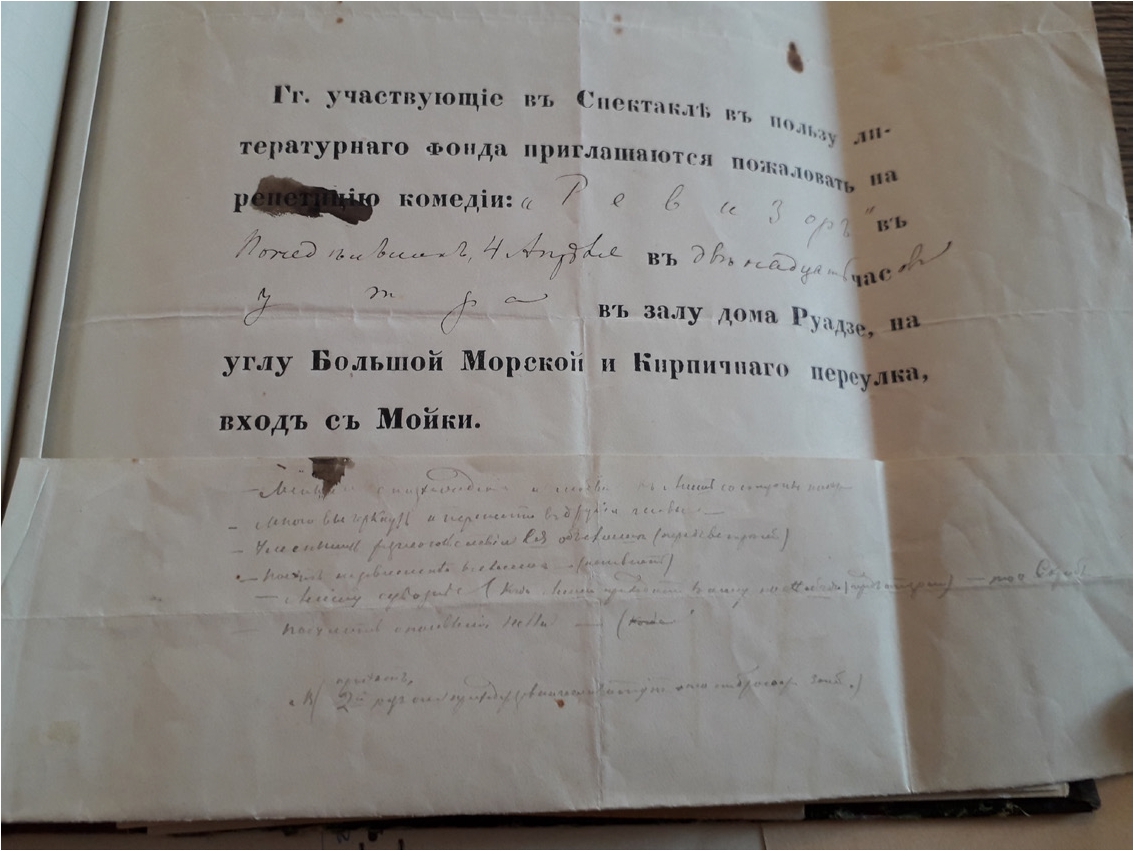 Илл. 5. Приглашение на спектакль «Ревизор» с черновыми записями Ф. М. Достоевского к роману «Униженные и оскорбленные» на обороте. ОРФ ГЛМ. Ф. 81. Оп. 2. Ед. хр. 27. Лл. 4–4 об.