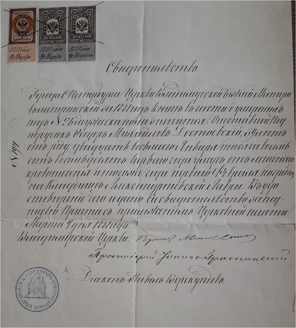 Илл. 8. «Свидетельство о смерти и погребении Ф. М. Достоевского, выданное причтом церкви Владимирской Божьей Матери в С.-Петербурге. 9 марта 1881» с гербовыми марками и церковной печатью. ОРФ ГЛМ. Ф. 81. Оп. 2. Ед. хр. 22. Л. 26