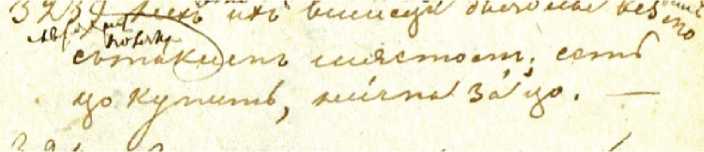 В «Сибирской тетради» встречается довольно много переданных кириллицей польских и малороссийских выражений. Интересный случай представляет собой запись под № 323: «{А вотъ я зналъ поляка} Нехъ ихъ вшисци дьяблы везмо съ ткимъ мястомъ; есть цо купить, ни́ма зá цо» (Л. 19). Первое слово — записанное кириллицей польское niech («пусть»).9 Данное прочтение, помимо контекста, подсказывает и графика, несмотря на то, что начало слова в рукописи частично перекрыто знаком вставки — первая буква имеет графические признаки прописной «Н»: