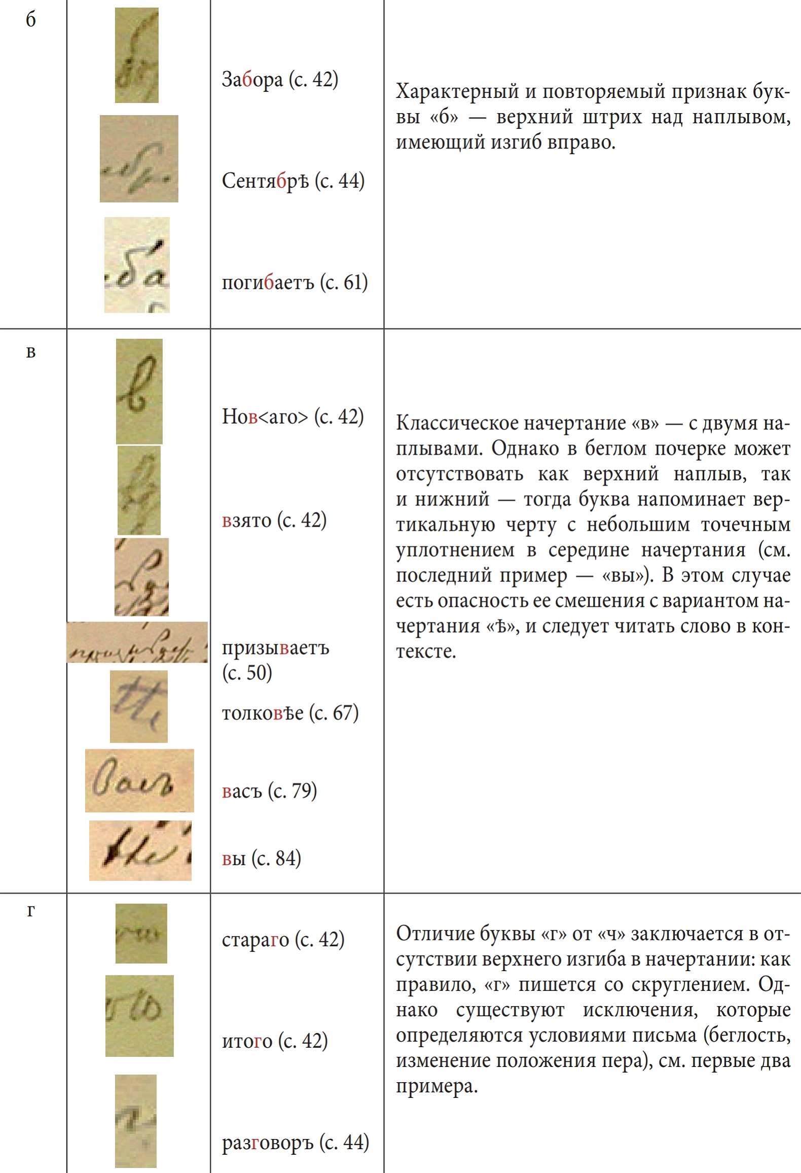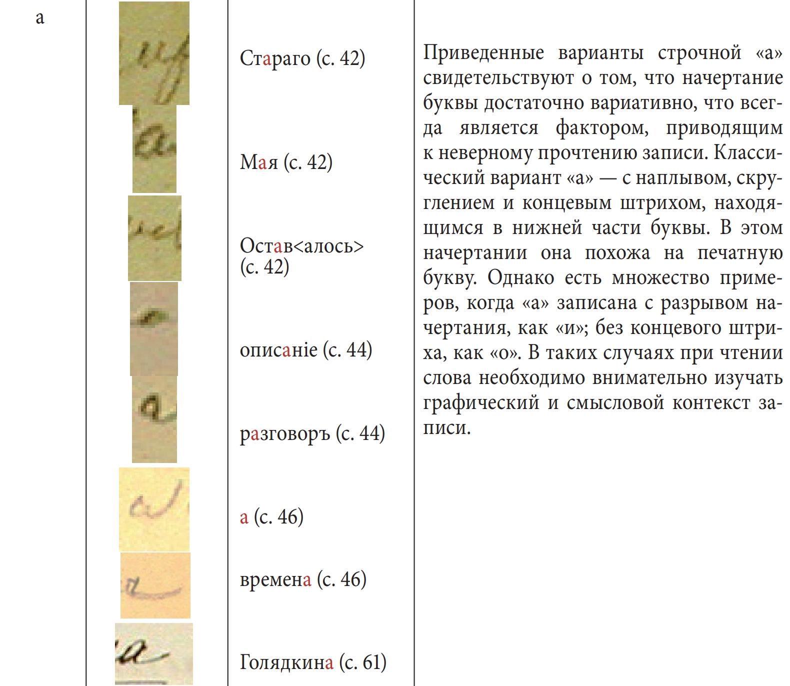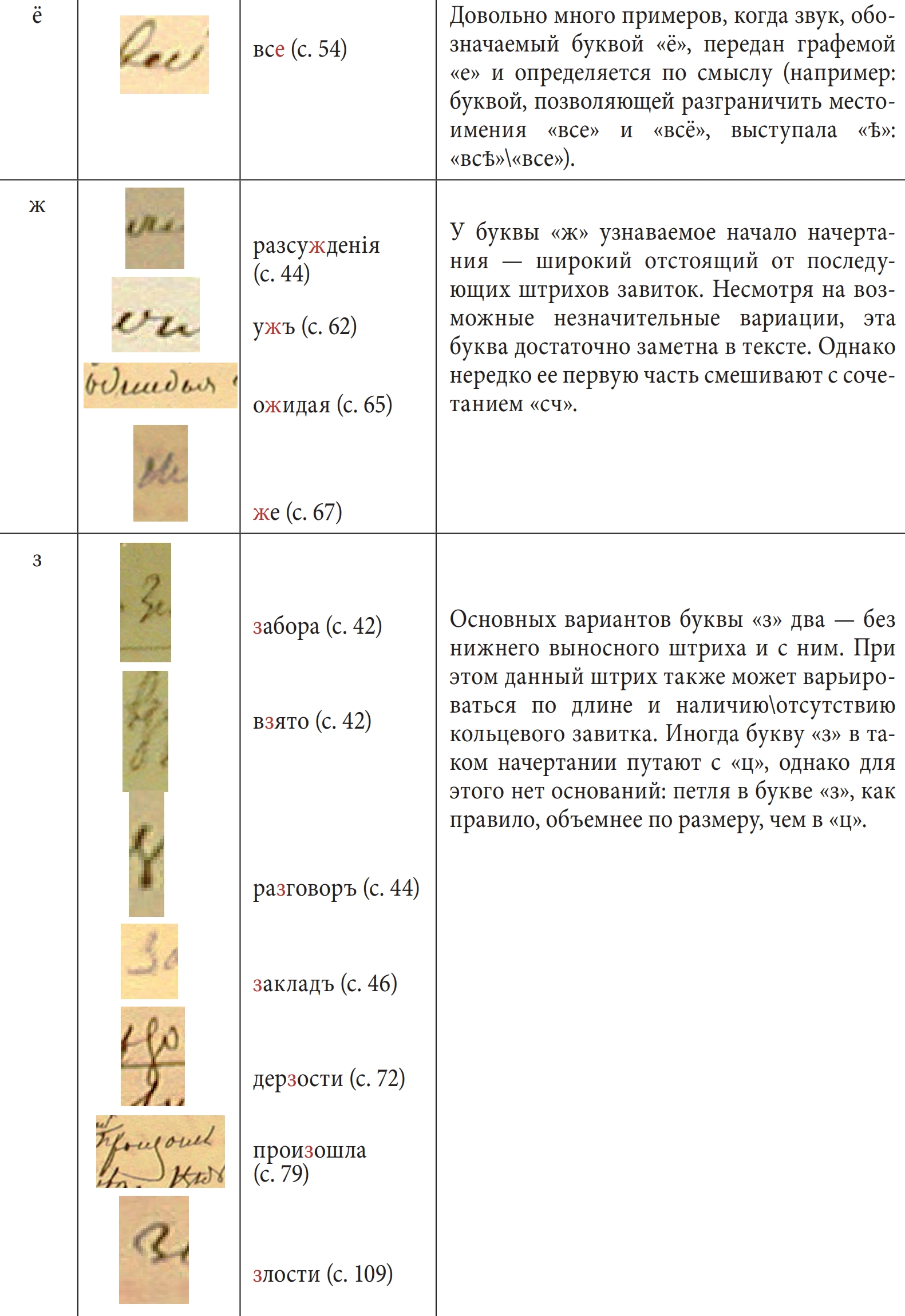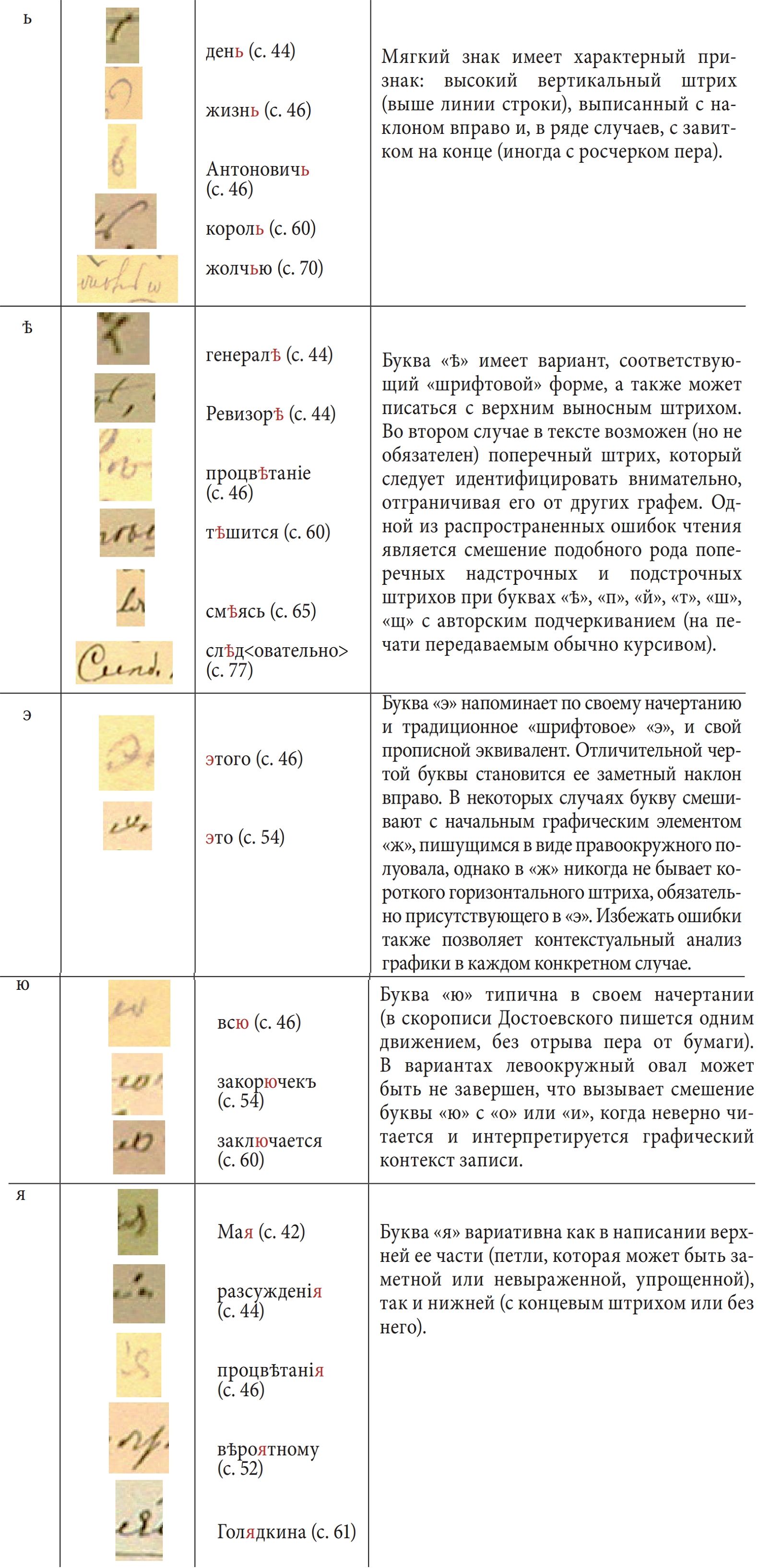 Начальным этапом данного исследования стало прочтение рукописей, обнаружение разночтений с их первыми научными изданиями6. На втором этапе велись наблюдения над написаниями всех букв алфавита (как строчных, так и прописных), осуществлялась их систематизация. Наконец, на третьем этапе мы попытались проследить, как менялся почерк в пределах одной записной книжки, и дать характеристику каждой букве алфавита Достоевского. Результаты представлены в таблице ниже.
