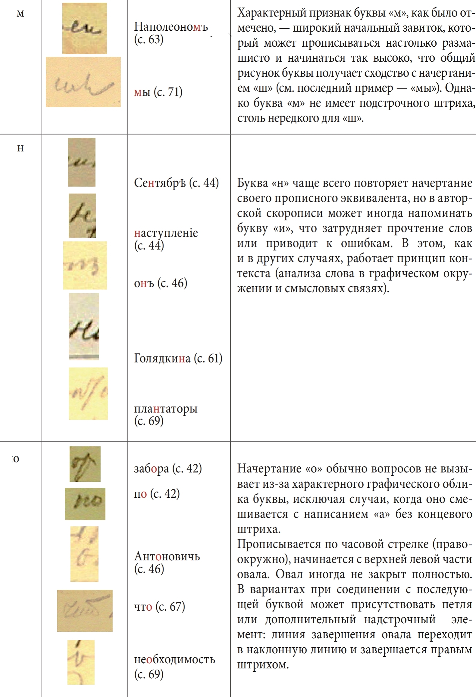 Концевые гласные часто смешиваются из-за нечеткого начертания или недописанности. При четкой графике главное отличие «о» и «и» в конце слов в почерке Достоевского состоит в том, что буква «и» уходит в росчерк пера, а в букве «о» нет росчерка и не вырисовывается овал: