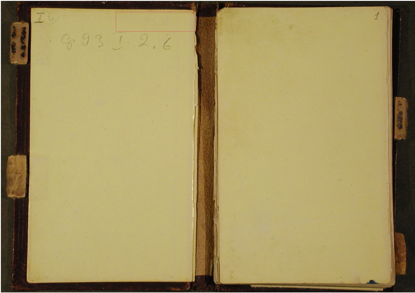 4 В книжке двойная нумерация: постраничная и полистная. На левой стороне переднего форзаца и правой стороне заднего форзаца — нумерация римскими и арабскими цифрами: I и 116. (II) соответственно. На правой стороне заднего форзаца — подклеенный бумажный кармашек, который тоже пронумерован: 116. а. (III). На левой стороне переднего форзаца римская цифра «I» нанесена поверх арабской цифры «1», рядом написана цифра 6, обведенная в полукруг. Свободный лист форзаца (правый) выпал, и его в перевернутом виде вернули на место. Первоначально он имел постраничную нумерацию «2» (сохранилась в левом нижнем углу), а потом, видимо позже, была сделана полистная нумерация в правом верхнем углу — «1».