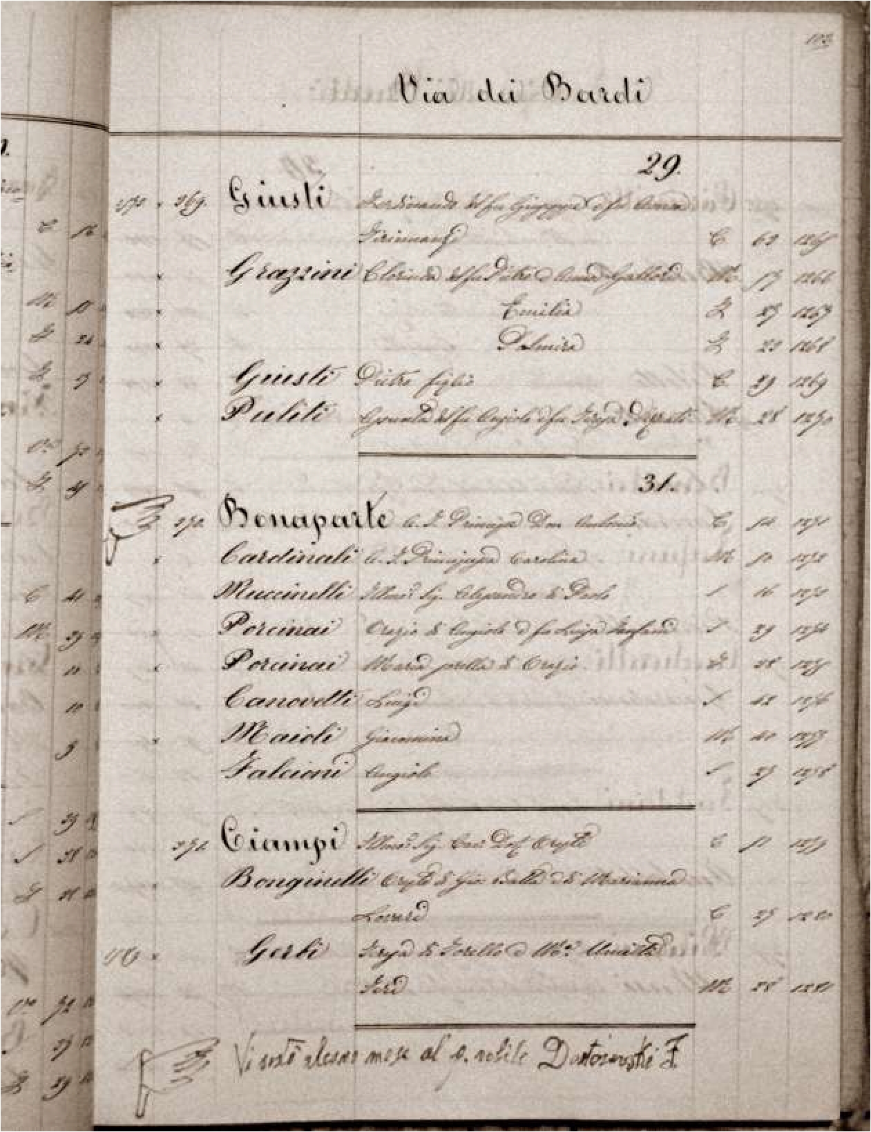 Следует отметить, что адресов, по которым проживал Достоевский во Флоренции, не два, как считалось ранее, а, по крайней мере, три или даже четыре. Первый, где он проживал сразу по прибытии, в конце 1868 г., — на ул. Гвиччардини, 8, как указано в абонементной записи «Кабинета Вьёссё»; второй — обнаружен нами недавно в реестре жителей («Stato delle Anime») прихода Санта-Феличита за 1869 г. (A.S.P.S.F., рукопись 29, с. 100), в котором имеется отметка о том, что Достоевский несколько месяцев проживал в бельэтаже на Виа де Барди, 31 (via de’Bardi): «Vi sostò alcuno mese al p. nobile Dostoievski F.» (см. Илл. 3).