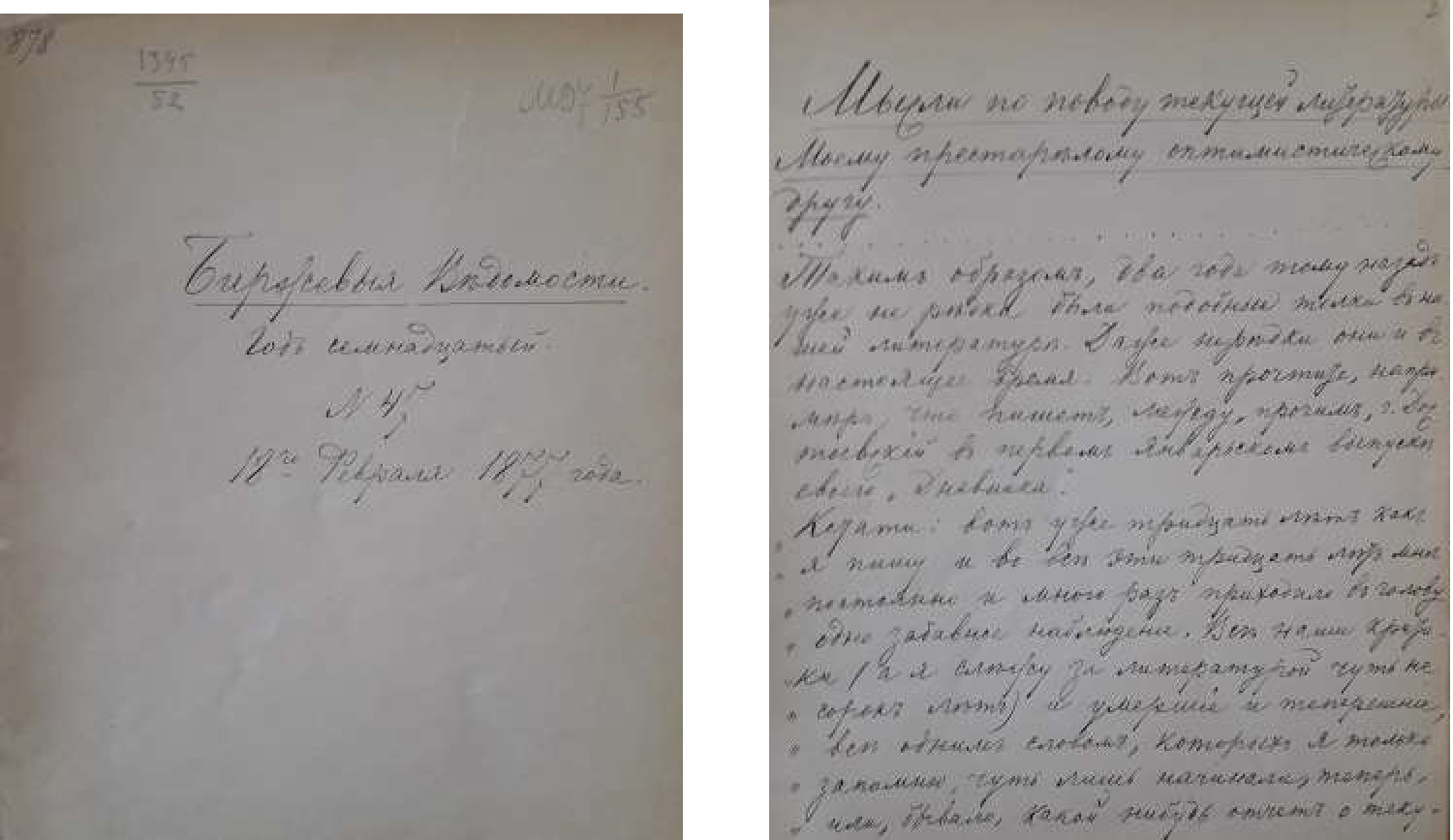 Документы представляют собою фрагменты заметок, статей и рецензий о Достоевском периода 1846–1914 гг., переписанные рукой Анны Григорьевны2. После 1881 г. в состав тетрадей включаются составительницей и вырезки из газет, вклеенные в канцелярские книги. Общий объем этих материалов — 2 391 лист на русском языке и 59 листов на французском, немецком, итальянском языках. Их изучение позволит уточнить и дополнить общую картину работы А. Г. Достоевской по сохранению памяти писателя. Как известно, в «Дневнике писателя» (напр., в выпусках за январь — март 1876 г., август 1881 г.) Достоевский отвечал своим газетным оппонентам или полемизировал с ними. Сохранившиеся материалы открывают один из неизвестных замыслов А. Г. Достоевской по созданию в «Музее памяти Ф. М. Достоевского», организованного ею, раздела со сводом критики, посвященной анализу творчества великого писателя.