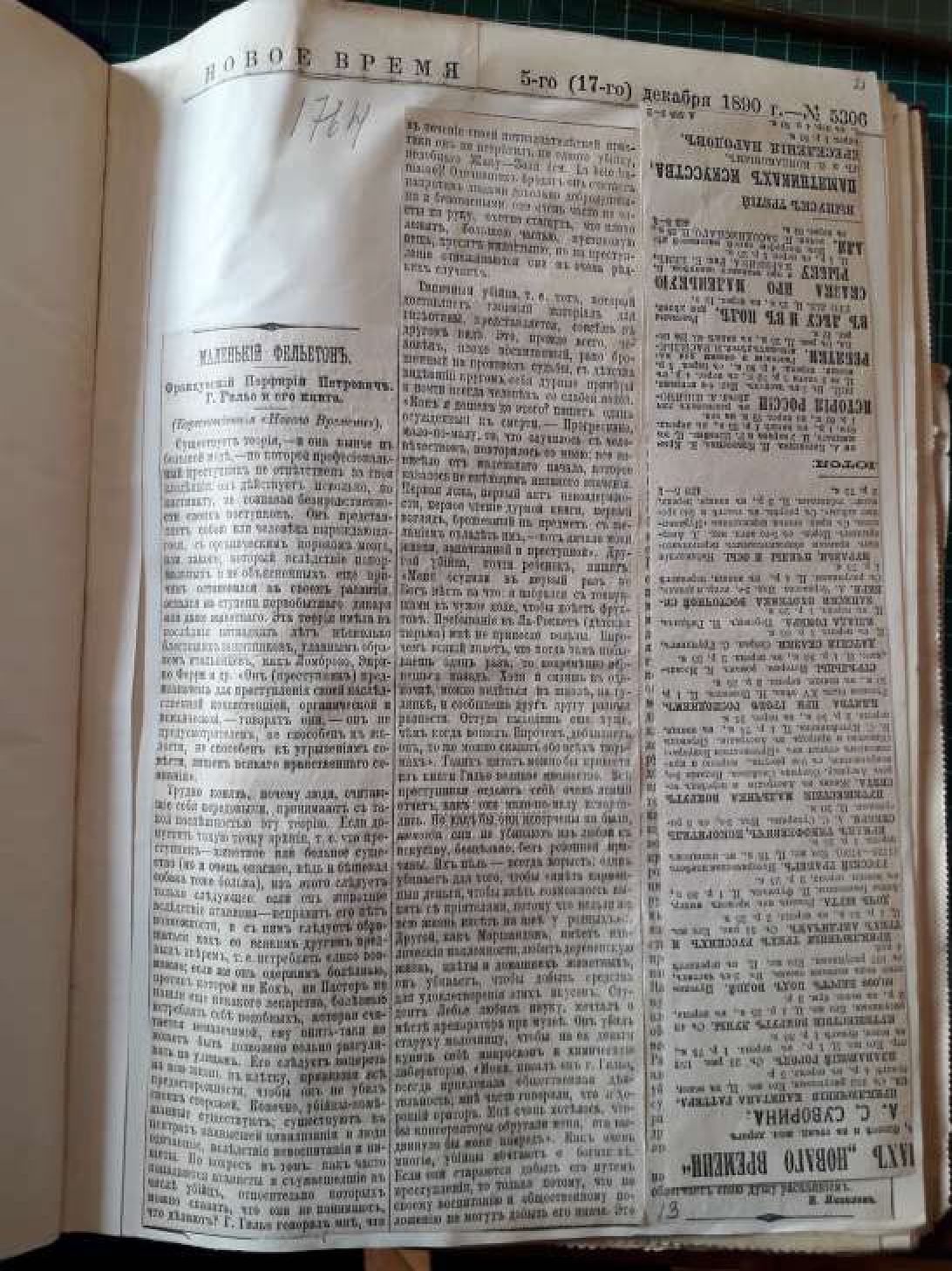 «Библіографическое обозрѣніе // Сѣверная пчела. 1861. 6 августа. № 176. Рецензия на: Сочинения Ф. М. Достоевского. Москва. 1860 г. 2 части — «Униженные и оскорбленные». Роман в 4-х частях. Время. № 1–6»; «“Тысяча восемьсотъ пятый годъ”. Графа Льва Толстого. Часть первая и вторая. М. 1866 // Книжный Вѣстникъ на 1866 годъ. 1867. 15 сентября. № 16–17 (дело № 29; есть упоминание о «Преступлении и наказании» Ф. М. Достоевского).