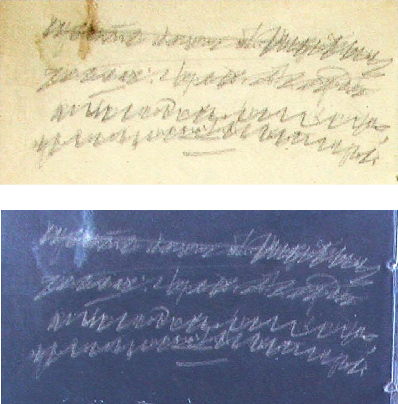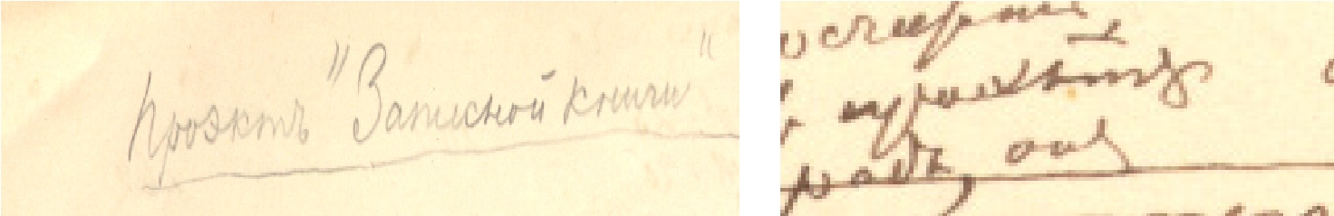 В ЗК1 мы нашли еще одну запись, касающуюся этого проекта, она расположена внизу с. 4, в направлении, обратном основному тексту, и не была прочитана в первых публикациях. Запись сделана карандашом, густо зачеркнута, но при обращении непосредственно к оригиналу, а также (если говорить о фотокопии) при усилении контрастности рисунка отдельные слова прочитать можно, так как угадываются характерные для почерка писателя буквы и буквенные сочетания (см. Илл. 1).