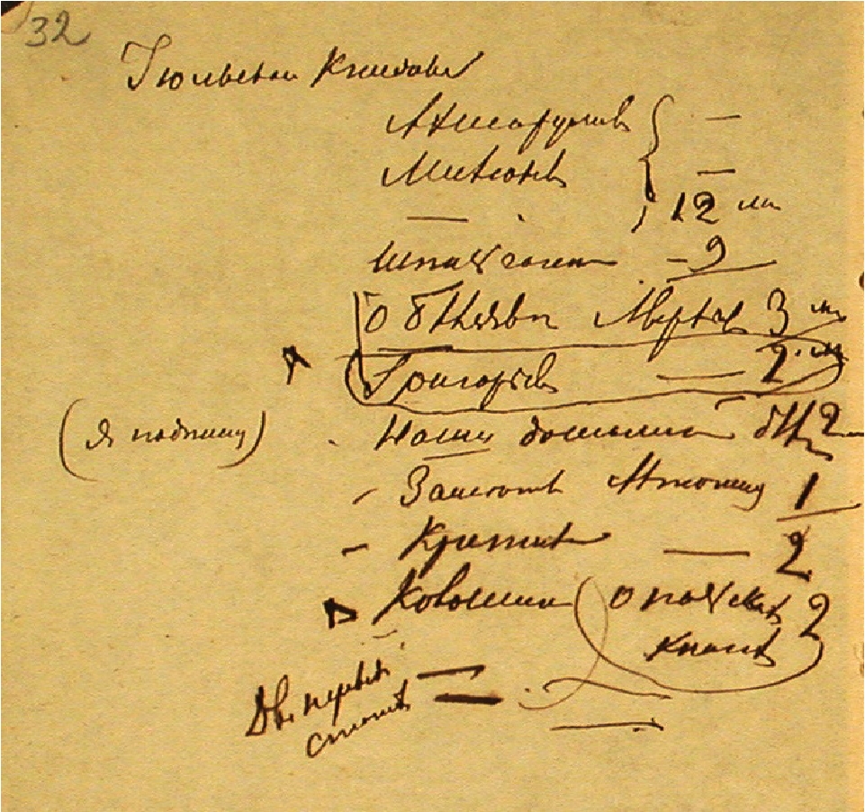 Следующая запись на с. 32: «Колошинъ о польскихъ книгахъ — 2 л.» (см. Илл. 8) оставалась до недавнего времени без комментария. По предположению В. Н. Захарова, здесь имеется в виду статья под рабочим названием «Польша и ее конфедерация», отмеченная в записной тетради Достоевского 1864–1865 гг. (РГАЛИ. Ф. 212.1.3. С. 14) [Захаров, 2013b: 60].