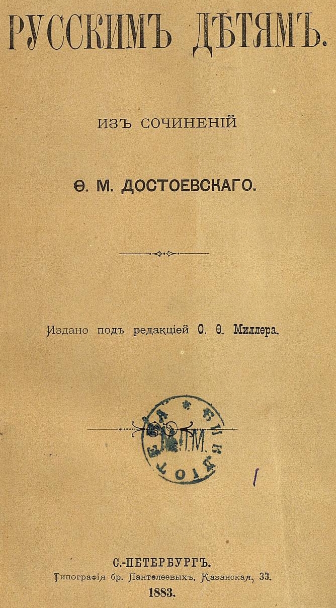 «Можно было бы обойтись без предисловия, если бы не мысль, что люди, привыкшие думать по шаблонам, заметят наверное: “Достоевский — не для детей”. Это даже кто-то высказал в печати, когда вышел в свет сборник “Русским детям”, составленный проф. О. Ф. Миллером. Конечно, целиком, весь — Достоевский не для детей. Но ведь нет ни одного писателя, которого целиком можно было бы взять для библиотеки юных читателей» [Круглов: III].
