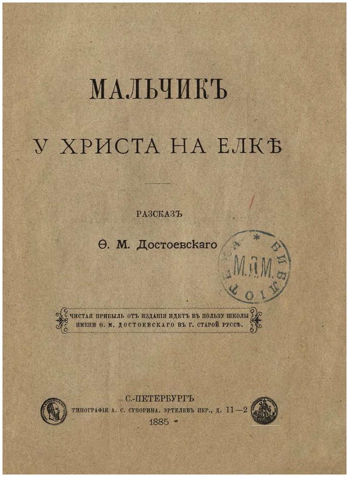 25 Мальчик у Христа на елке. Рассказ Ф. М. Достоевского (Чистая прибыль от издания идет в пользу школы имени Ф. М. Достоевского в г. Старой Руссе). С 4-мя рисунками и портретом автора. СПб.: Тип. А. С. Суворина, 1885; Мужик Марей — Столетняя Ф. М. Достоевского. (Чистая прибыль от издания идет в пользу школы имени Ф. М. Достоевского в г. Старой Руссе). С 4-мя рисунками и портретом автора. СПб.: Тип. А. С. Суворина. 1885.