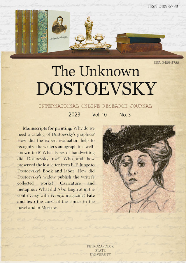 The article aims to explore the correspondence between F. M. Dostoevsky and the famous artist and memoirist E. F. Junge, who was the wife of ophthalmologist Dr. E. A. Junge. Dostoevsky was Dr. Junge’s patient in the 1860s and 1870s. E. F. Junge met the writer in the last year of his life, and she was an admirer of his talent, as well as a correspondent. Two letters from E. F. Junge to the writer, sent in March and April of 1880, are known to exist. There are also two letters from Dostoevsky, one in draft form and the other a clean copy, dated April 10 and April 11 of the same year. The study places special emphasis on the autograph of Junge’s March letter to the writer. This letter was initially published by the bibliographer A. P. Novitsky in the preface to Junge’s memoirs, which were published in 1914. However, the autograph of the letter was subsequently lost. As a result, the letter written by Junge in March 1880 has been quoted from either the first publication or its republication, which was done in 1959 by A. S. Dolinin. In 2021, during the preparation of the description for “The Handwritten Legacy of F. M. Dostoevsky,” efforts were made to search for the document in the collections of the State Historical Museum, the Archive of the Russian Academy of Arts, and the Russian State Historical Archive. Unfortunately, this search yielded no results. The authors of the article eventually found a copy of the lost letter to Junge in A. G. Dostoevskaya’s notebook from 1881. Unlike Novitsky’s publication, this copy more accurately reflects the original letter. Therefore, the source for any future publications of the lost letter of Junge should be considered the copy found in A. G. Dostoevskaya’s notebook. The article also analyzes letters from the 1880s–1890s addressed to A. G. Dostoevskaya from E. F. Junge, as well as from A. I. Tolstaya (her mother) and A. P. Novitsky. For the first time, a donation inscription to Novitsky from the writer’s widow on the title page is published. The annex to the article includes three documents: a list of the March 1880 letter from E. F. Junge to Dostoevsky, taken from his widow’s notebook; a response letter from the writer, which reflects the edits he made and indicates errors in previous publications of the letter; and a letter from A. P. Novitsky to A. G. Dostoevskaya dated April 25, 1897.