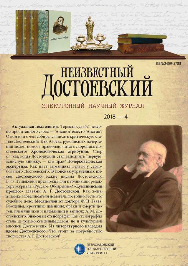 The article introduces into scientific discourse an unknown source of biographical data about the family of A. M. Dostoevsky, younger brother of the writer. It is a commemorative edition of a family menology in Church Slavonic dated back to 1849 and kept in the LiteraryMemorial Museum of F. M. Dostoevsky in St. Petersburg. On its margins in front of the corresponding dates Andrei Mikhailovich placed records about family events, such as birthdays, baptismal ceremonies, weddings and deaths of his children, the writer’s nephews and nieces. The author of the article considers the mentioned records as a primary source, even in regard to notorious memories of A. M. Dostoevsky. On the fly page of the calendar of months together with a provenance there is a record, made by an unidentified hand which testifies the fact of obtainment of the book by Andrei Mikhailovich from doctor F. P. Gaaz. The article makes an attempt to reconstruct the circumstance under which the writer’s brother could meet a legendary “holy doctor”.