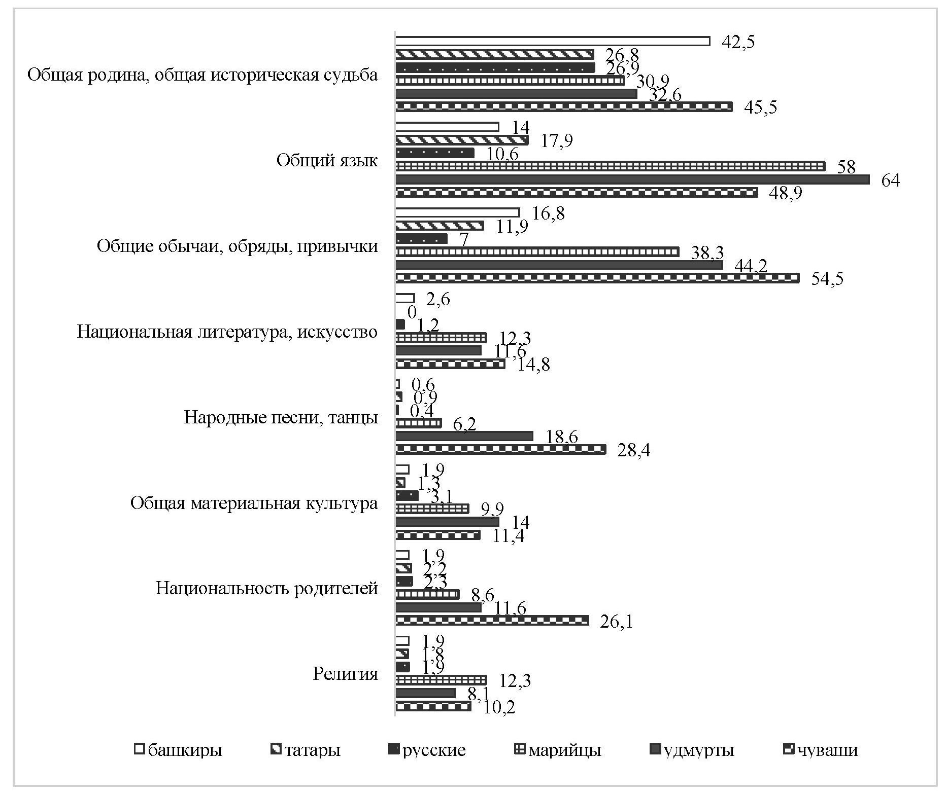 Марийцы, как и удмурты, в качестве основного индикатора, который их роднит с людьми своей национальности, выбрали общий национальный язык, показатель которого существенно превышал ответ представителей других этнических групп (рис. 4). На второе место марийцы (38,3 %) и удмурты (44,2 %), а также тюркоязычные чуваши (54,5 %) поставили маркер «общие обычаи, обряды, привычки». Если татары (26,8 %) и русские (26,9 %) на первое место поставили «общую родину и общую историческую судьбу», то среди опрошенных марийцев (30,9 %), удмуртов (32,6 %) и чувашей (45,5 %) данный показатель был существенно выше, хотя занимал лишь третью позицию (рис. 4). Следовательно, для марийцев маркер «общей родины и общей исторической судьбы» также представляется одной из значимых категорий проявления внутриэтнической солидарности. Особую ценность и значимость в ощущении близости с представителями своей этнической группы марийцы высоко оценили роль национальной литературы и искусства (12,3 %), языческую религию (12,3 %), общую материальную культуру (9,9 %), а также национальность родителей (8,6 %), народные песни и танцы (6,2 %) (рис. 4).