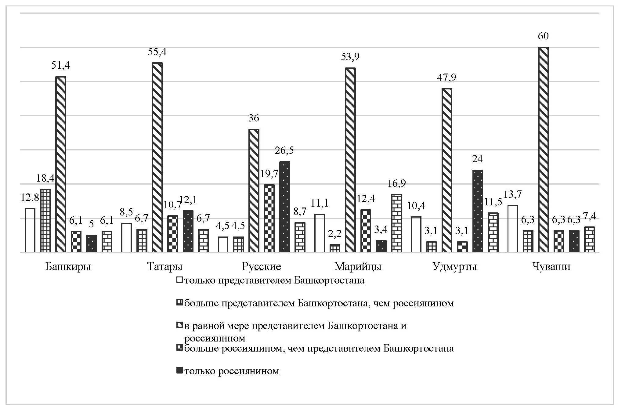 Данные опроса выявили, что марийцы, определяя свою этногосударственную идентичность, показывают себя глубокими патриотами как одноименной республики [18], так и Республики Башкортостан, в которой проживают (рис. 5). Показатели принадлежности только к представителям Башкортостана у марийцев были одними из высоких, наряду с респондентами титульной этнической группы (12,8 %), удмуртами (10,4 %) и чувашами (13,7 %). В целом для марийцев, как и для большинства представителей республики, характерна двойная идентичность, при которой более половины опрошенных (53,9 %) идентифицировали себя в равной мере представителем Башкортостана и россиянином. При этом каждый 12 респондент из ста опрошенных марийцев чувствовал себя больше россиянином, чем представителем Башкортостана, уступая в этом только русским (19,7 %).