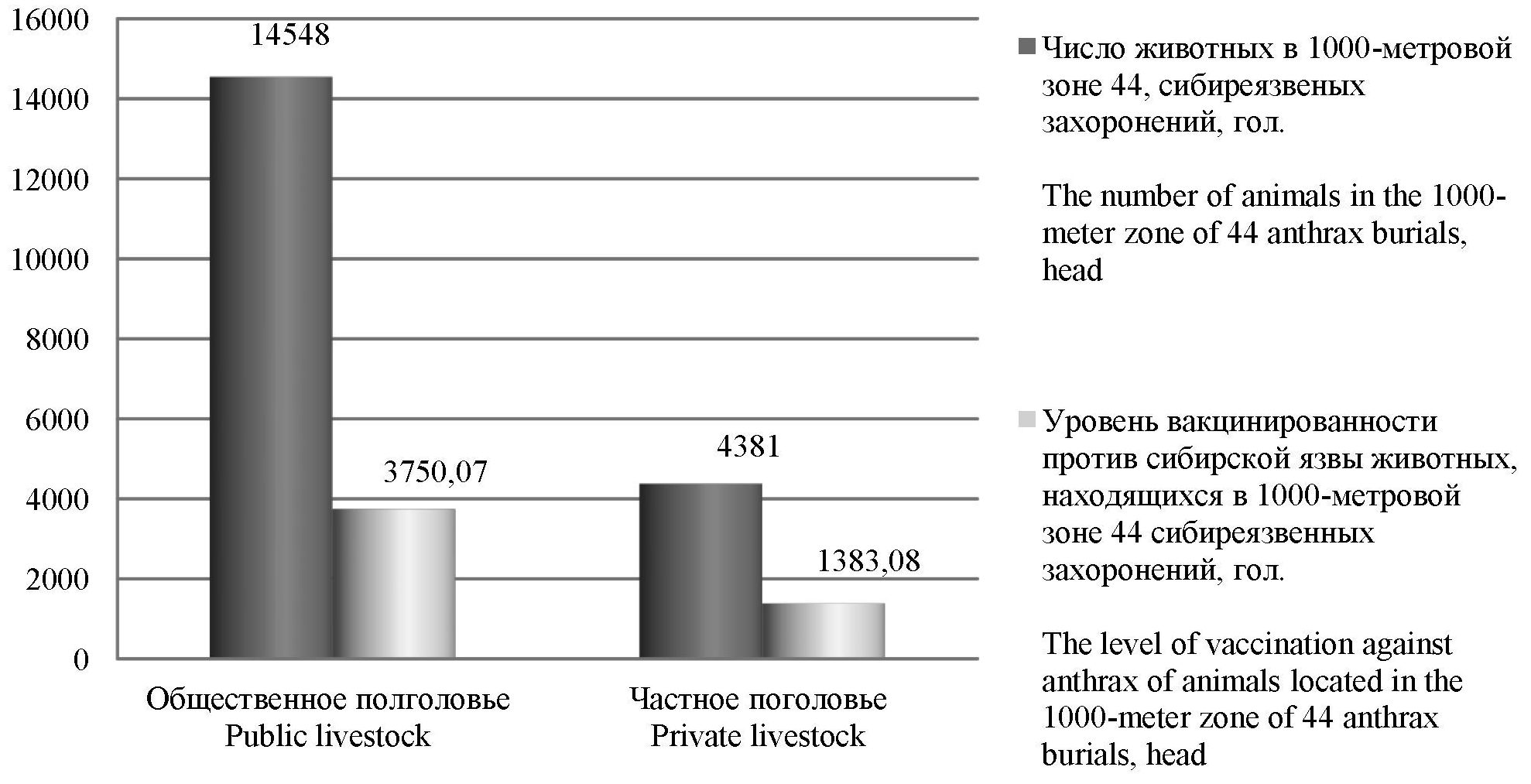 Results, discussion. It has been established that the vaccination rate of farm animals susceptible to anthrax in the territories adjacent to anthrax graves is at a level not reaching 35 %, both in the private and public sectors of the Udmurt Republic.