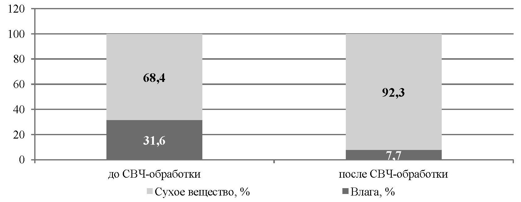 Анализ химического состава зерна (ячменя) показал, что после СВЧ-обработки в течение 120 секунд при частоте 915 ГГц и мощности 50 кВт уменьшилась массовая доля влаги на 75,6 %, что вызвало повышение массовой доли сухого вещества на 35 % (рис. 1).