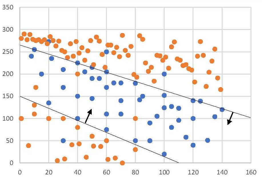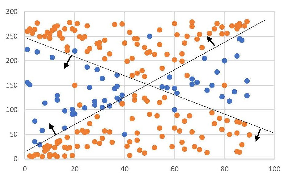 Следует отметить, что чисто теоретически без разницы, какое из множеств считать за , а другое за . На рисунке 2 видно, что для смены множеств местами (в модели) достаточно развернуть градиент одной из гиперплоскостей.