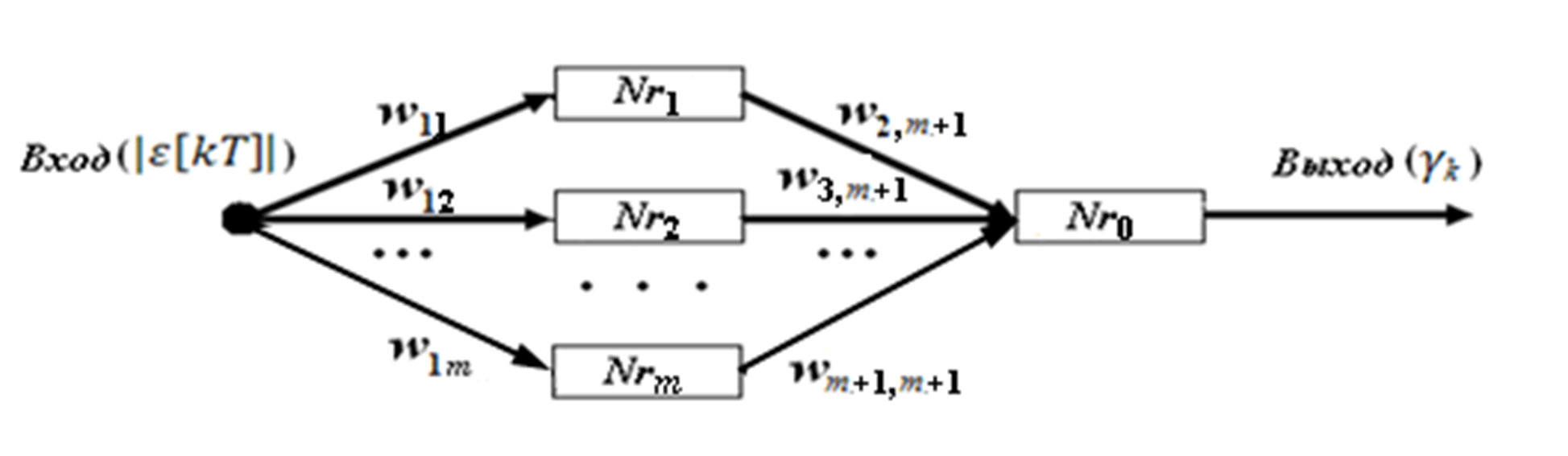 Здесь Nri – нейроны скрытого слоя (i=1..m), w11,w12,…,w1m, w2,m+1,w3,m+1,…, wm+1,m+1 – весовые коэффициенты, образующие матрицу весовых коэффициентов W. Данная ИНС сформирована на основе модуляционной характеристики вида [5, 6]: