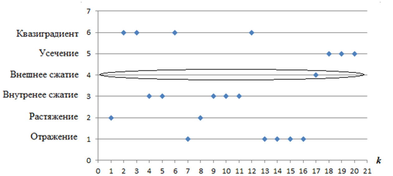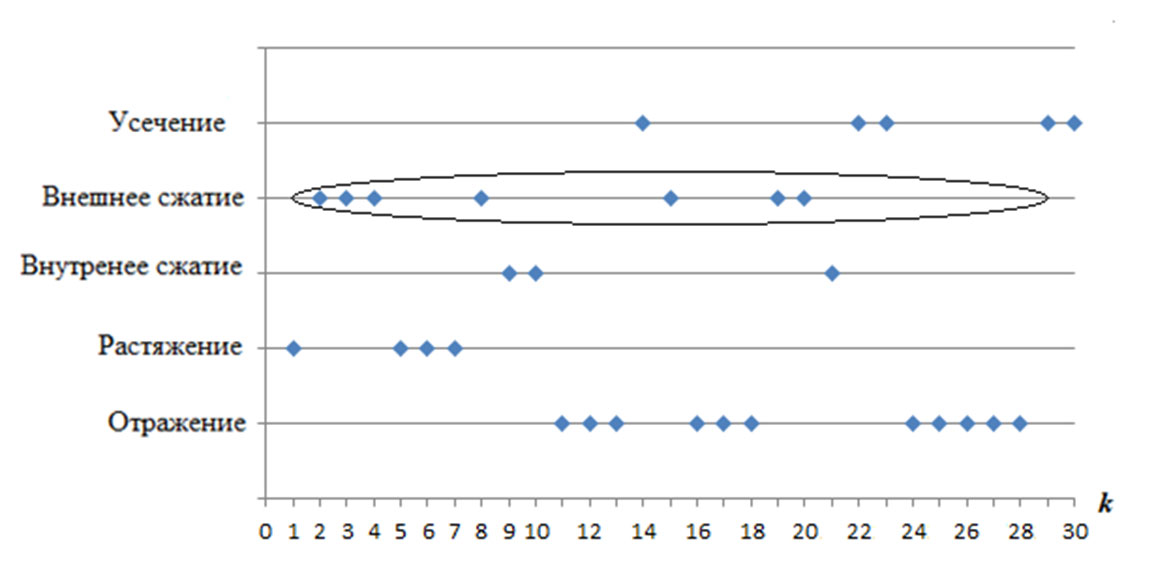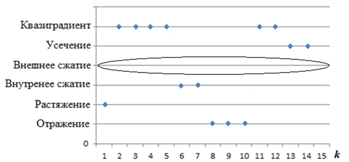 Для устранения вышесказанного в статье предлагается в алгоритмы ввести правило, что в случае неуспешности классической операции отражения сравниваться между собой будут точки, полученные после операции сжатия и отражения по дополнительному направлению, и уже среди них выбирается точка с наименьшим значением критерия.