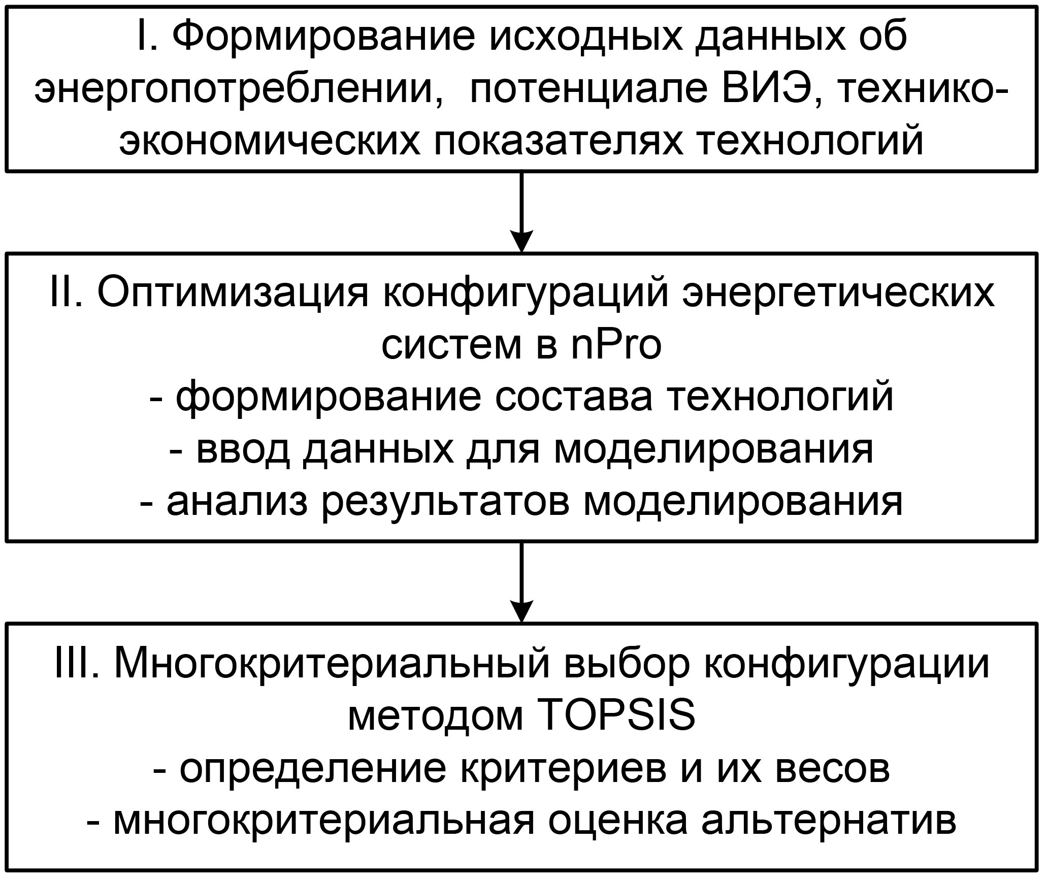 Модели и методы. На рис. 1 представлены этапы предлагаемого подхода для оптимизации и многокритериального выбора автономной энергетической системы.