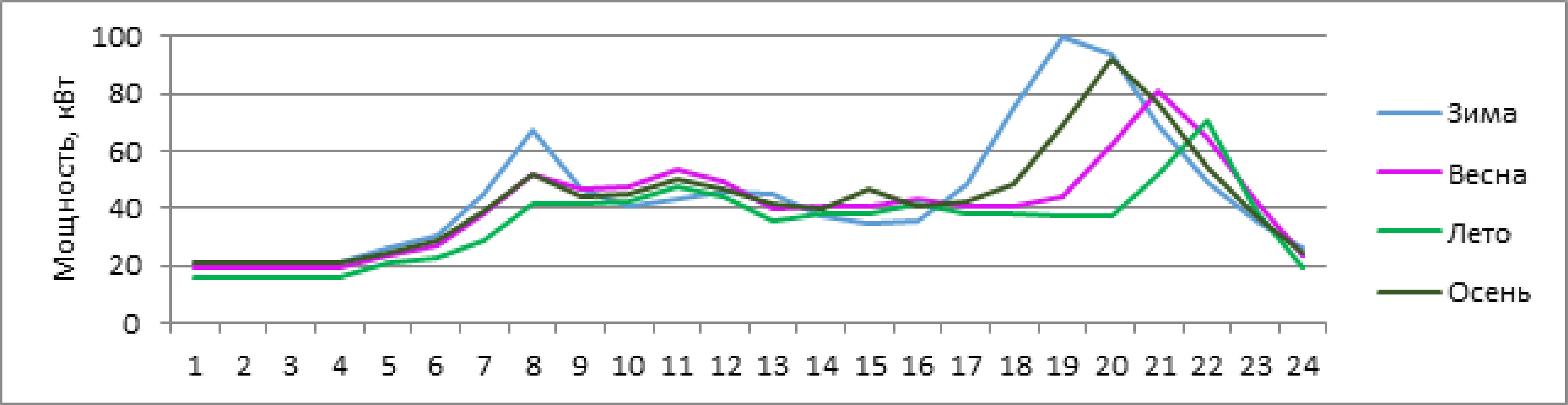 Рис. 2. Суточные графики электрических нагрузок с. Усть-Соболевка для 4-х сезонов